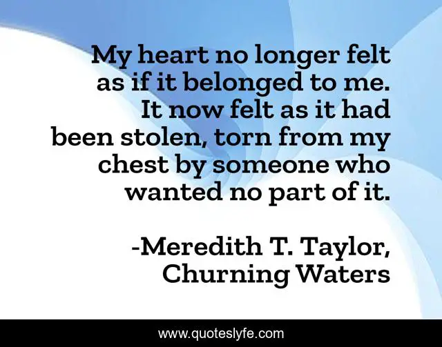 This page presents the quote "My heart no longer felt as if it belonged to me. It now felt as it had been stolen, torn from my chest by someone who wanted no part of it.". Author of this quote is Meredith T. Taylor, Churning Waters. This quote is about love, first-love, heartbreak, unrequited-love, heartbroken, affection,.