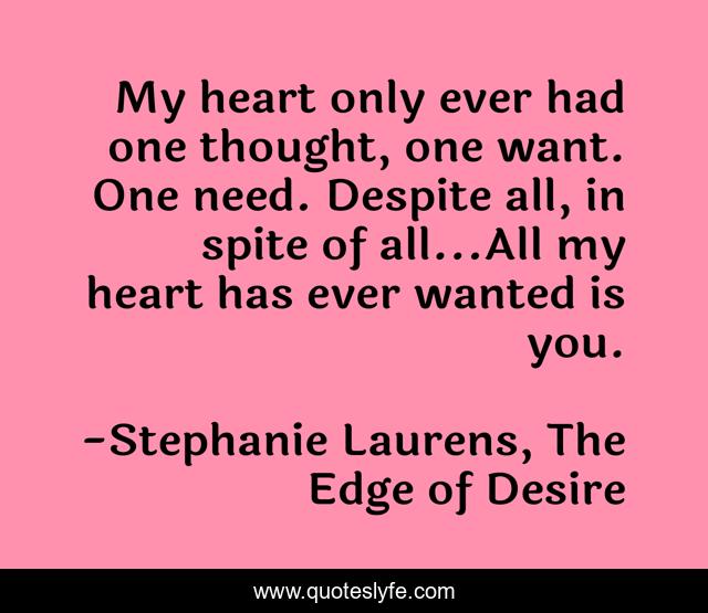 This page presents the quote "My heart only ever had one thought, one want. One need. Despite all, in spite of all...All my heart has ever wanted is you.". Author of this quote is Stephanie Laurens, The Edge of Desire. This quote is about longing, adoration, love, romance, yearning, need, dream, affection,.