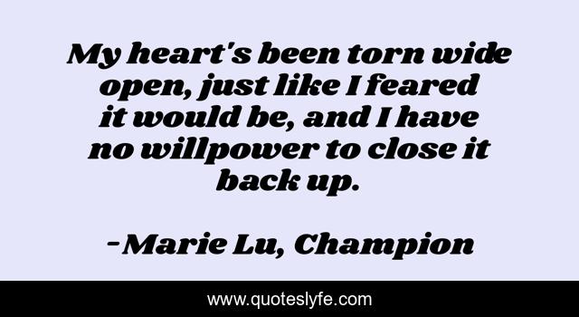 This page presents the quote "My heart's been torn wide open, just like I feared it would be, and I have no willpower to close it back up.". Author of this quote is Marie Lu, Champion. This quote is about heart, heartbreak, open-heart,.
