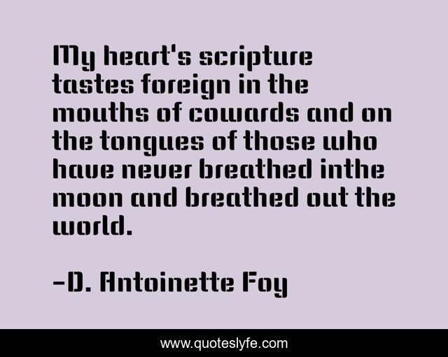 This page presents the quote "My heart's scripture tastes foreign in the mouths of cowards and on the tongues of those who have never breathed inthe moon and breathed out the world.". Author of this quote is D. Antoinette Foy. This quote is about heart, life, love, truth, spilled-ink, coward, writer, poem, poetry,.