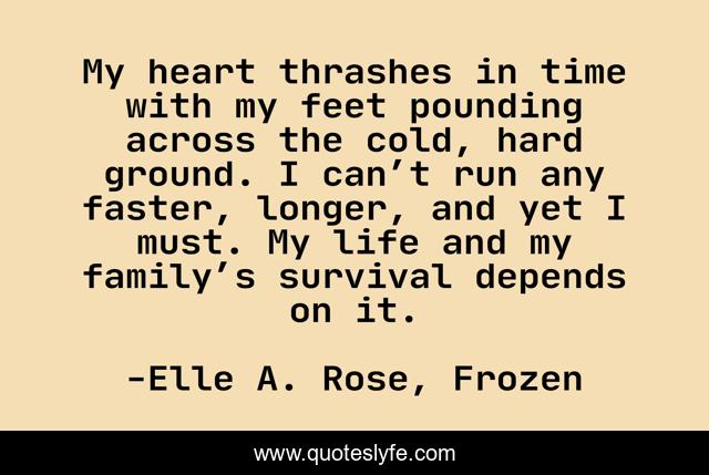 This page presents the quote "My heart thrashes in time with my feet pounding across the cold, hard ground. I can’t run any faster, longer, and yet I must. My life and my family’s survival depends on it.". Author of this quote is Elle A. Rose, Frozen. This quote is about ya, sci-fi-fantasy,.