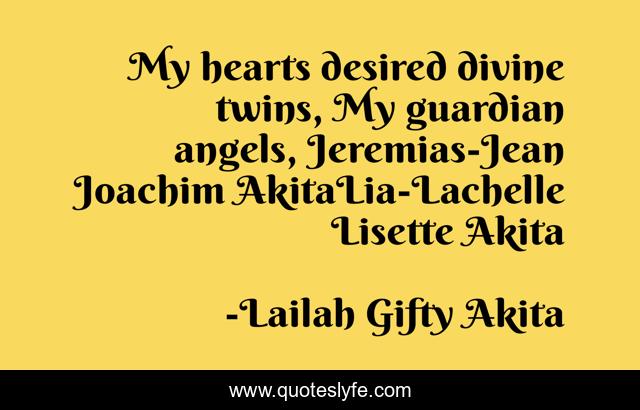 This page presents the quote "My hearts desired divine twins, My guardian angels, Jeremias-Jean Joachim AkitaLia-Lachelle Lisette Akita". Author of this quote is Lailah Gifty Akita. This quote is about divine, divine-grace, divine-inspiration, twins, hearts-desire, divine-intervention,.