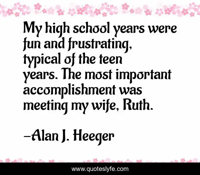 This page presents the quote "My high school years were fun and frustrating, typical of the teen years. The most important accomplishment was meeting my wife, Ruth.". Author of this quote is Alan J. Heeger. This quote is about fun, school, wife,.