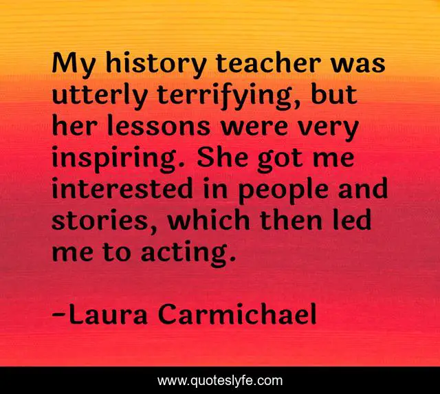 This page presents the quote "My history teacher was utterly terrifying, but her lessons were very inspiring. She got me interested in people and stories, which then led me to acting.". Author of this quote is Laura Carmichael. This quote is about me, history, people,.