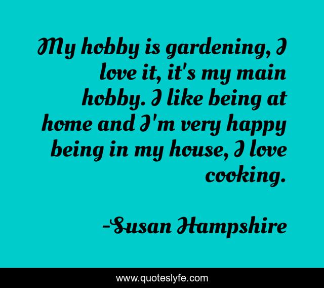 This page presents the quote "My hobby is gardening, I love it, it's my main hobby. I like being at home and I'm very happy being in my house, I love cooking.". Author of this quote is Susan Hampshire. This quote is about home, love, affection, happy,.