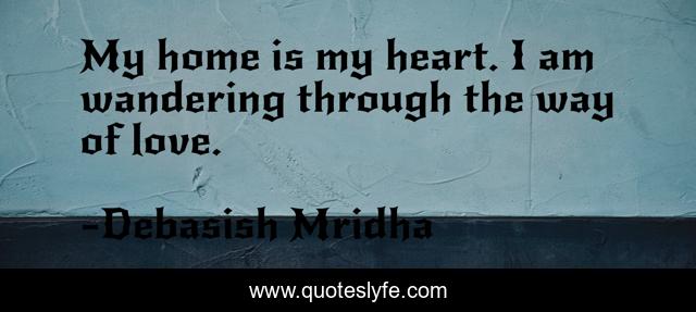 This page presents the quote "My home is my heart. I am wandering through the way of love.". Author of this quote is Debasish Mridha. This quote is about home-is-my-heart, love, philosophy, debasish-mridha, quotes, wandering-through-love, inspirational, home, enthusiasm,.