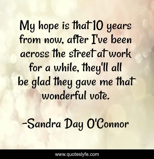 This page presents the quote "My hope is that 10 years from now, after I've been across the street at work for a while, they'll all be glad they gave me that wonderful vote.". Author of this quote is Sandra Day O'Connor. This quote is about me, work, hope,.