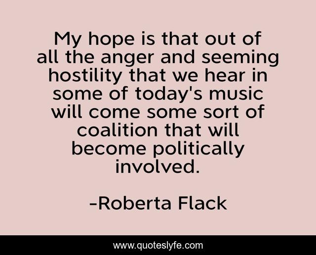 This page presents the quote "My hope is that out of all the anger and seeming hostility that we hear in some of today's music will come some sort of coalition that will become politically involved.". Author of this quote is Roberta Flack. This quote is about music, hope, today,.