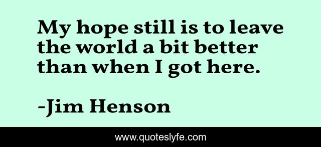 This page presents the quote "My hope still is to leave the world a bit better than when I got here.". Author of this quote is Jim Henson. This quote is about life, humor, inspirational, enthusiasm, henson, hope,.