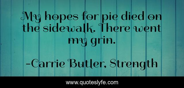 This page presents the quote "My hopes for pie died on the sidewalk. There went my grin.". Author of this quote is Carrie Butler, Strength. This quote is about new-adult, mature-ya, strength, upper-ya, speculative, paranormal, crossover, romance, crossover-fiction,.