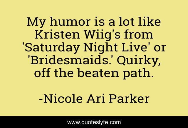 This page presents the quote "My humor is a lot like Kristen Wiig's from 'Saturday Night Live' or 'Bridesmaids.' Quirky, off the beaten path.". Author of this quote is Nicole Ari Parker. This quote is about path, live, night,.