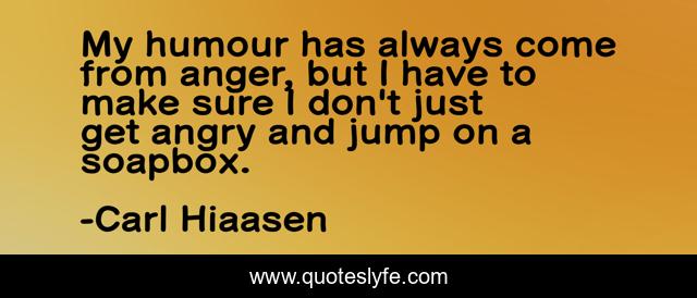 This page presents the quote "My humour has always come from anger, but I have to make sure I don't just get angry and jump on a soapbox.". Author of this quote is Carl Hiaasen. This quote is about jump, angry, humour,.