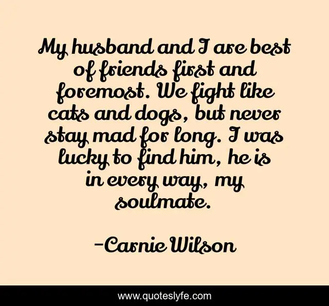 This page presents the quote "My husband and I are best of friends first and foremost. We fight like cats and dogs, but never stay mad for long. I was lucky to find him, he is in every way, my soulmate.". Author of this quote is Carnie Wilson. This quote is about marriage, cats, friends,.