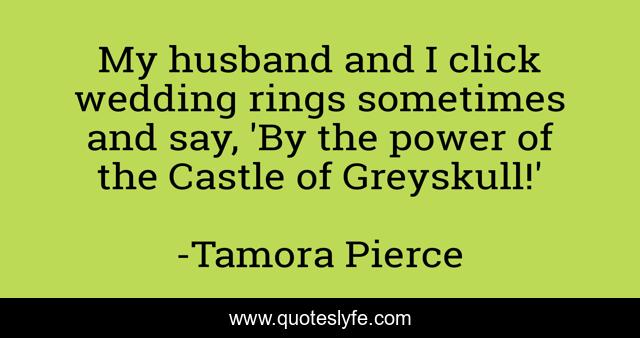 This page presents the quote "My husband and I click wedding rings sometimes and say, 'By the power of the Castle of Greyskull!'". Author of this quote is Tamora Pierce. This quote is about castle, power, husband,.