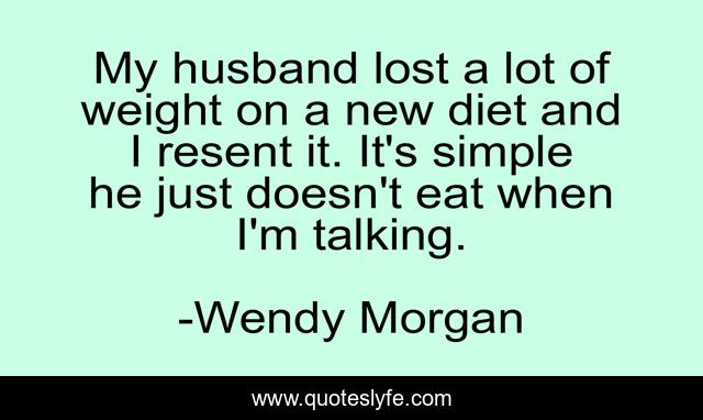 This page presents the quote "My husband lost a lot of weight on a new diet and I resent it. It's simple he just doesn't eat when I'm talking.". Author of this quote is Wendy Morgan. .