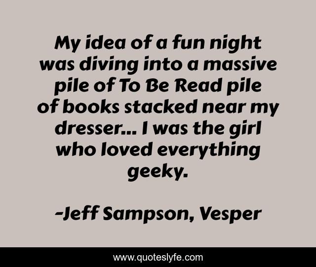 This page presents the quote "My idea of a fun night was diving into a massive pile of To Be Read pile of books stacked near my dresser... I was the girl who loved everything geeky.". Author of this quote is Jeff Sampson, Vesper. This quote is about geek, reading, emily-webb, introvert,.