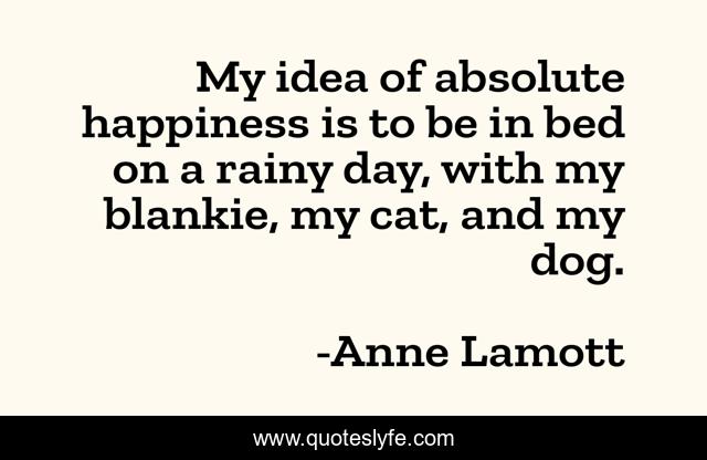 This page presents the quote "My idea of absolute happiness is to be in bed on a rainy day, with my blankie, my cat, and my dog.". Author of this quote is Anne Lamott. This quote is about dog, day, cat,.