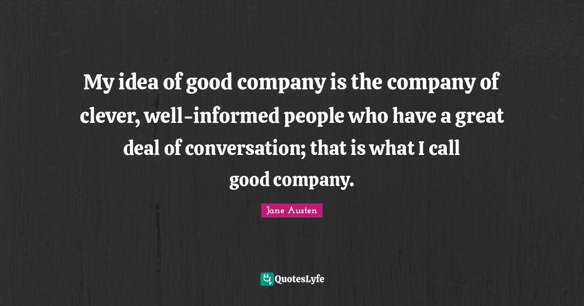 This page presents the quote "My idea of good company is the company of clever, well-informed people who have a great deal of conversation; that is what I call good company.". Author of this quote is Jane Austen. This quote is about inspiring, good company, people, clever, conversation, company, ideas,.