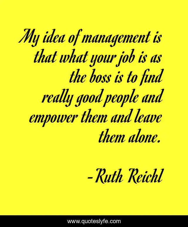 This page presents the quote "My idea of management is that what your job is as the boss is to find really good people and empower them and leave them alone.". Author of this quote is Ruth Reichl. This quote is about good, management, boss,.