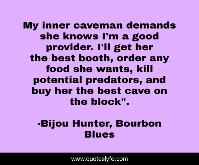 This page presents the quote "My inner caveman demands she knows I'm a good provider. I'll get her the best booth, order any food she wants, kill potential predators, and buy her the best cave on the block".". Author of this quote is Bijou Hunter, Bourbon Blues. .