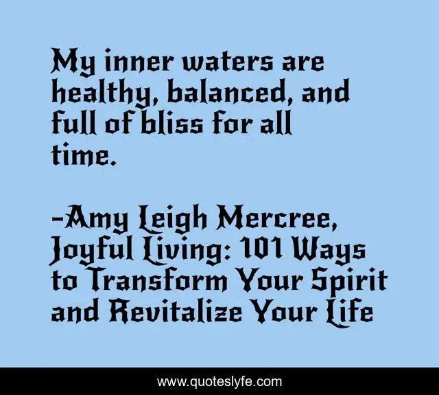 This page presents the quote "My inner waters are healthy, balanced, and full of bliss for all time.". Author of this quote is Amy Leigh Mercree, Joyful Living: 101 Ways to Transform Your Spirit and Revitalize Your Life. This quote is about life, quotes-de-la-vida, amy-leigh-mercree, inner-self, inner-waters, joyful-living, quotes-tumblr, bliss, joyful-living-101,.