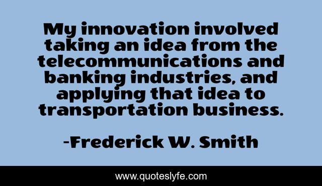 This page presents the quote "My innovation involved taking an idea from the telecommunications and banking industries, and applying that idea to transportation business.". Author of this quote is Frederick W. Smith. This quote is about transportation, innovation,.