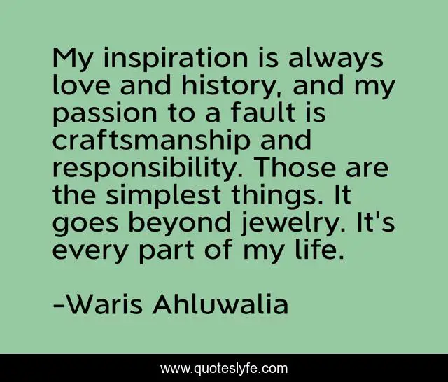 This page presents the quote "My inspiration is always love and history, and my passion to a fault is craftsmanship and responsibility. Those are the simplest things. It goes beyond jewelry. It's every part of my life.". Author of this quote is Waris Ahluwalia. This quote is about love, life, responsibility, affection,.
