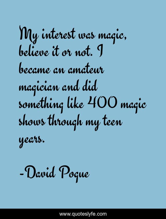 This page presents the quote "My interest was magic, believe it or not. I became an amateur magician and did something like 400 magic shows through my teen years.". Author of this quote is David Pogue. This quote is about magic, believe, through,.