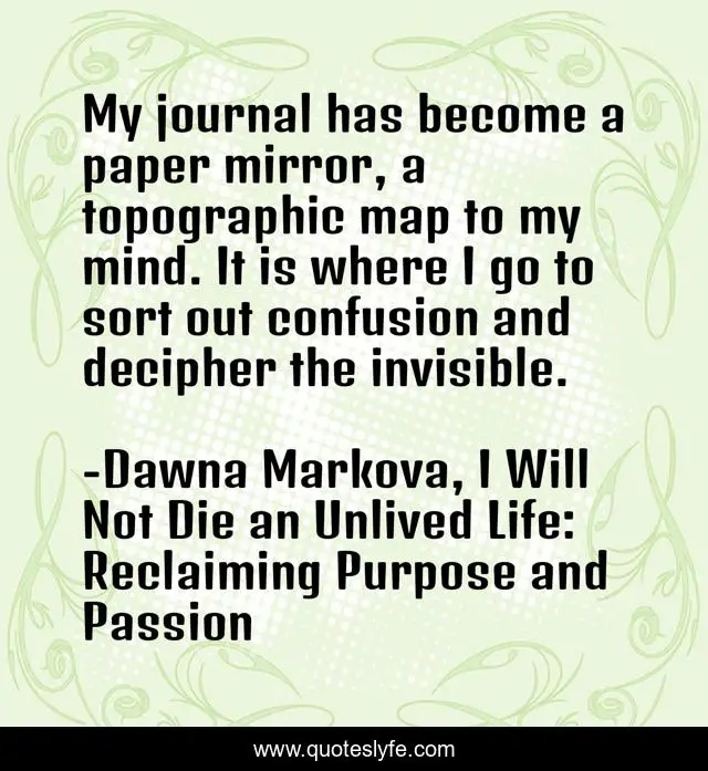 This page presents the quote "My journal has become a paper mirror, a topographic map to my mind. It is where I go to sort out confusion and decipher the invisible.". Author of this quote is Dawna Markova, I Will Not Die an Unlived Life: Reclaiming Purpose and Passion. This quote is about diary, confusion, journal, mind, mirror,.