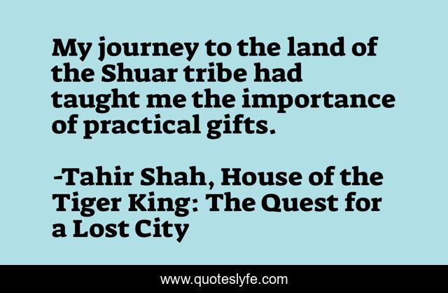 This page presents the quote "My journey to the land of the Shuar tribe had taught me the importance of practical gifts.". Author of this quote is Tahir Shah, House of the Tiger King: The Quest for a Lost City. This quote is about gifts, tribe, journey, adventure, shuar,.