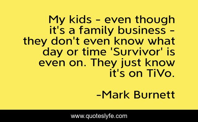 This page presents the quote "My kids - even though it's a family business - they don't even know what day or time 'Survivor' is even on. They just know it's on TiVo.". Author of this quote is Mark Burnett. This quote is about day, family, time,.