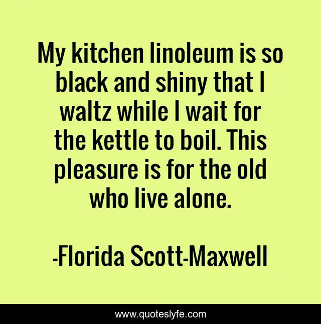 This page presents the quote "My kitchen linoleum is so black and shiny that I waltz while I wait for the kettle to boil. This pleasure is for the old who live alone.". Author of this quote is Florida Scott-Maxwell. This quote is about live, black, kitchen,.