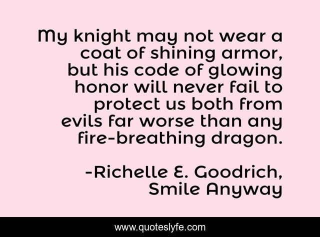 This page presents the quote "My knight may not wear a coat of shining armor, but his code of glowing honor will never fail to protect us both from evils far worse than any fire-breathing dragon.". Author of this quote is Richelle E. Goodrich, Smile Anyway. This quote is about protect, knight-in-shining-armor, champion, armor, knight, defend, dragon, evils, guard,.