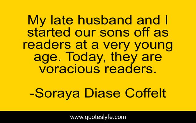 This page presents the quote "My late husband and I started our sons off as readers at a very young age. Today, they are voracious readers.". Author of this quote is Soraya Diase Coffelt. This quote is about quote, education, children, important, reading,.