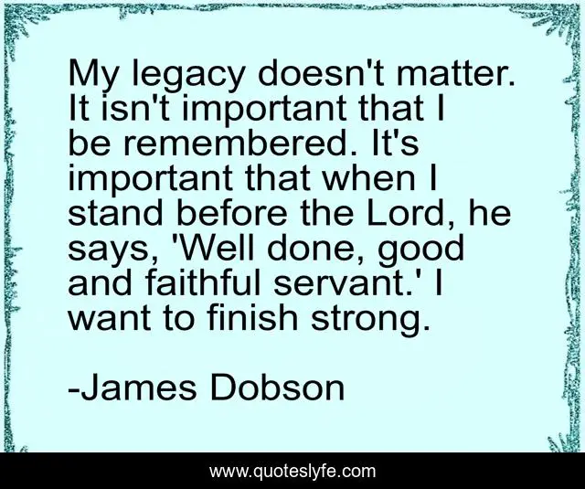 This page presents the quote "My legacy doesn't matter. It isn't important that I be remembered. It's important that when I stand before the Lord, he says, 'Well done, good and faithful servant.' I want to finish strong.". Author of this quote is James Dobson. This quote is about well done, strong, legacy,.