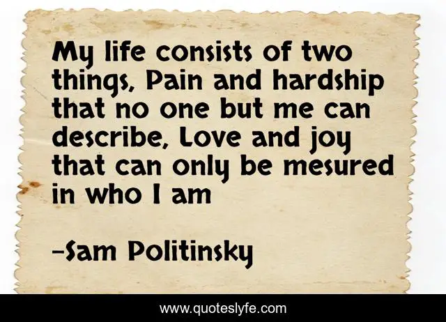 This page presents the quote "My life consists of two things, Pain and hardship that no one but me can describe, Love and joy that can only be mesured in who I am". Author of this quote is Sam Politinsky. This quote is about joy, life, lovers, pain, suffering,.