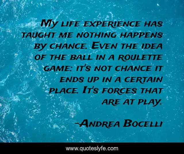 This page presents the quote "My life experience has taught me nothing happens by chance. Even the idea of the ball in a roulette game: it's not chance it ends up in a certain place. It's forces that are at play.". Author of this quote is Andrea Bocelli. This quote is about me, life, experience,.