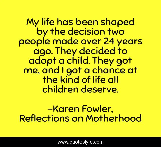 This page presents the quote "My life has been shaped by the decision two people made over 24 years ago. They decided to adopt a child. They got me, and I got a chance at the kind of life all children deserve.". Author of this quote is Karen Fowler, Reflections on Motherhood. This quote is about parenting, adoption, children,.