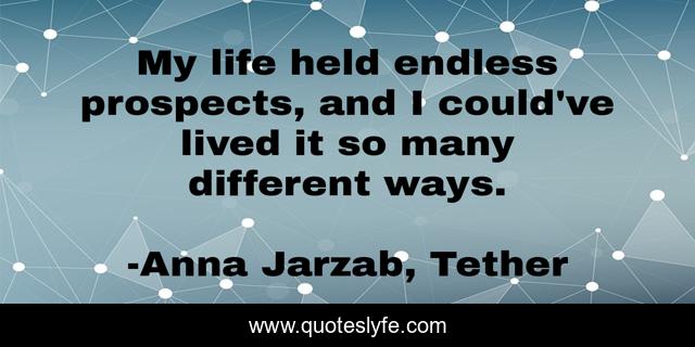 This page presents the quote "My life held endless prospects, and I could've lived it so many different ways.". Author of this quote is Anna Jarzab, Tether. This quote is about life, mgg, anna-jarzab, opportunities, tether, many-worlds,.