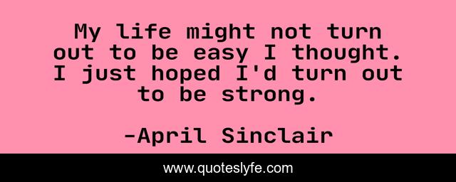 This page presents the quote "My life might not turn out to be easy I thought. I just hoped I'd turn out to be strong.". Author of this quote is April Sinclair. This quote is about life, strength, life-lessons, positive, motivational, confidence, optimistic, inspirational, life-philosophy,.
