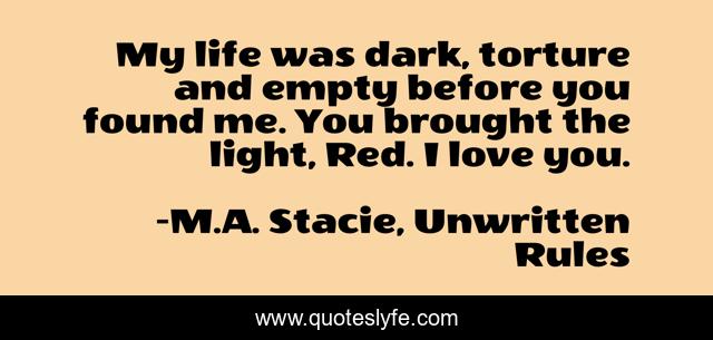 This page presents the quote "My life was dark, torture and empty before you found me. You brought the light, Red. I love you.". Author of this quote is M.A. Stacie, Unwritten Rules. This quote is about relationships, romance, love, affection,.
