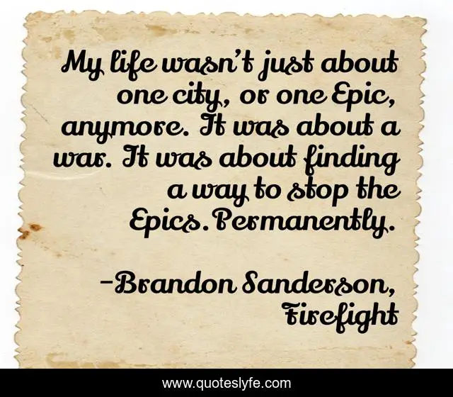 This page presents the quote "My life wasn’t just about one city, or one Epic, anymore. It was about a war. It was about finding a way to stop the Epics.Permanently.". Author of this quote is Brandon Sanderson, Firefight. This quote is about city, life, epics, stop, permanently, way, epic, war,.