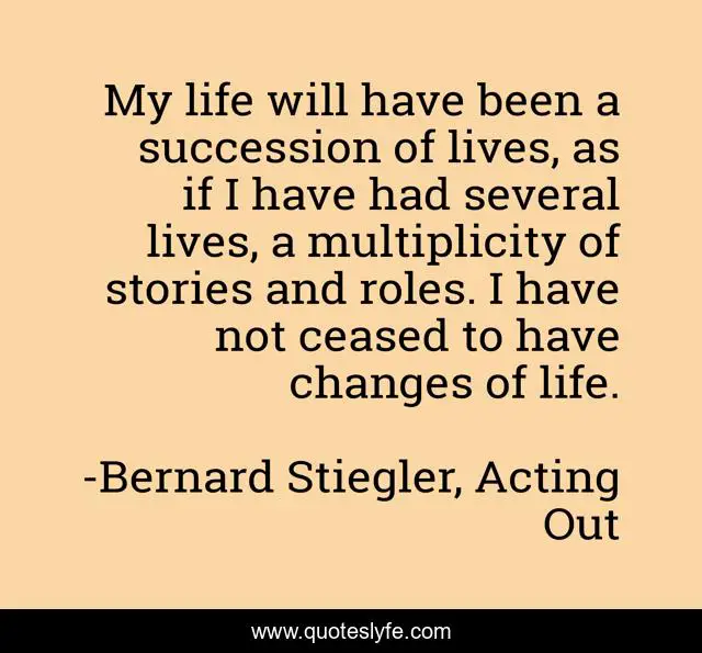 This page presents the quote "My life will have been a succession of lives, as if I have had several lives, a multiplicity of stories and roles. I have not ceased to have changes of life.". Author of this quote is Bernard Stiegler, Acting Out. This quote is about phenomenology, philosophy, technology,.