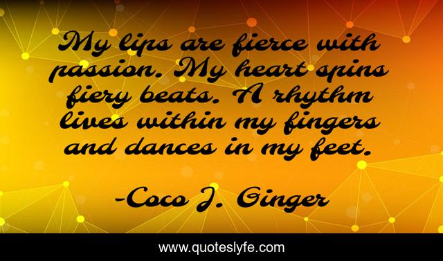 This page presents the quote "My lips are fierce with passion. My heart spins fiery beats. A rhythm lives within my fingers and dances in my feet.". Author of this quote is Coco J. Ginger. This quote is about love, dancing, writer, writing, passion, jamie-weise, affection,.