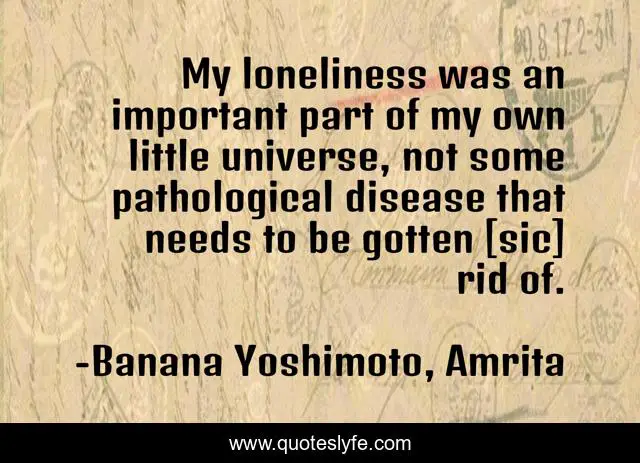 This page presents the quote "My loneliness was an important part of my own little universe, not some pathological disease that needs to be gotten [sic] rid of.". Author of this quote is Banana Yoshimoto, Amrita. This quote is about comfort, loneliness, solitude, aloneness, alone-but-not-lonely, comforting, alone,.