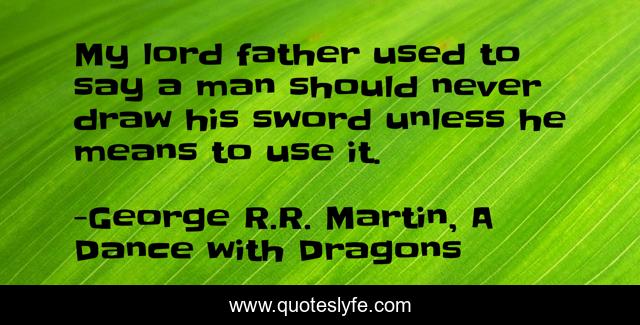 This page presents the quote "My lord father used to say a man should never draw his sword unless he means to use it.". Author of this quote is George R.R. Martin, A Dance with Dragons. This quote is about father, sword,.