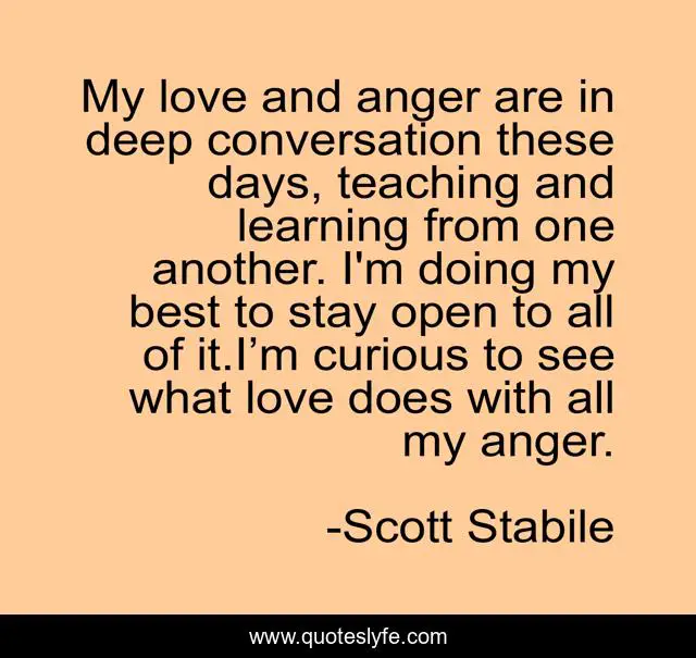 This page presents the quote "My love and anger are in deep conversation these days, teaching and learning from one another. I'm doing my best to stay open to all of it.I’m curious to see what love does with all my anger.". Author of this quote is Scott Stabile. This quote is about love, conversation, truth, anger, teach, affection,.