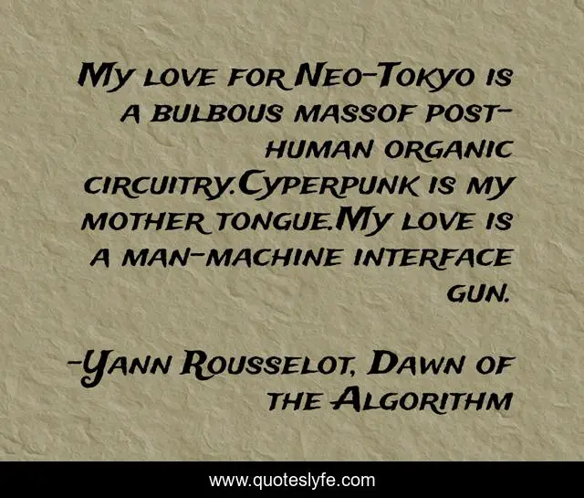 This page presents the quote "My love for Neo-Tokyo is a bulbous massof post-human organic circuitry.Cyperpunk is my mother tongue.My love is a man-machine interface gun.". Author of this quote is Yann Rousselot, Dawn of the Algorithm. This quote is about humour, akira, science, poetry, manga, alternative, apocalypse, weird,.
