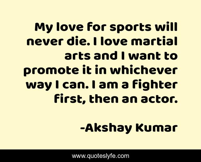 This page presents the quote "My love for sports will never die. I love martial arts and I want to promote it in whichever way I can. I am a fighter first, then an actor.". Author of this quote is Akshay Kumar. This quote is about love, affection,.
