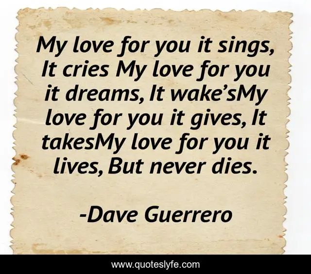 This page presents the quote "My love for you it sings, It cries My love for you it dreams, It wake’sMy love for you it gives, It takesMy love for you it lives, But never dies.". Author of this quote is Dave Guerrero. This quote is about life, love, relationship, affection, inspiration,.